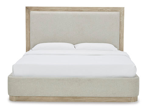 يتميز السرير المنجد بتصميم مدمج من هينينغتون بتصميم هيكلي على قاعدة قاعدة ترتقي